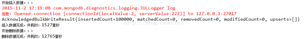 public void bulkWriteDelete(List<Document> documents){ List<WriteModel<Document>> requests = new ArrayList<WriteModel<Document>>(); for (Document document : documents) { //删除条件 Document queryDocument = new Document("_id",document.get("_id")); //构造删除单个文档的操作模型, DeleteOneModel<Document> dom = new DeleteOneModel<Document>(queryDocument); requests.add(dom); } BulkWriteResult bulkWriteResult = collection.bulkWrite(requests); System.out.println(bulkWriteResult.toString()); }测试:10万条数据